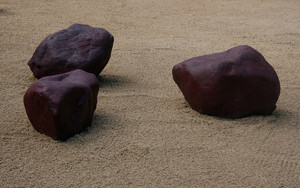 Die dünne Haut eines Findlingssteines wird durch die Bergung des Fundes häufig beschädigt. Dünne rötliche Farbe wird direkt mit den Händen aufgetragen, sodass ein zweiter verletzlicher Schutzmantel entsteht. [Hülle für die Hülle] Die vollflächige einheitliche Farbe lässt die Ursprungsform deutlich hervortreten.
