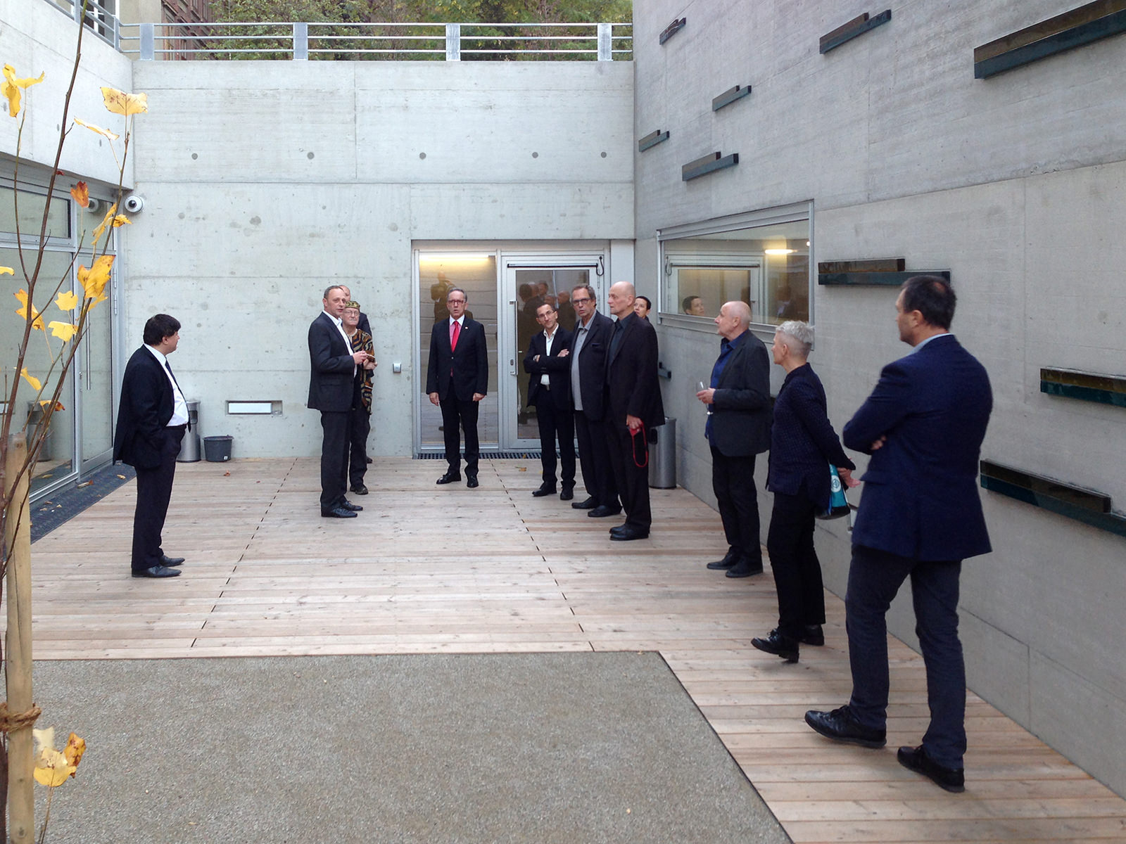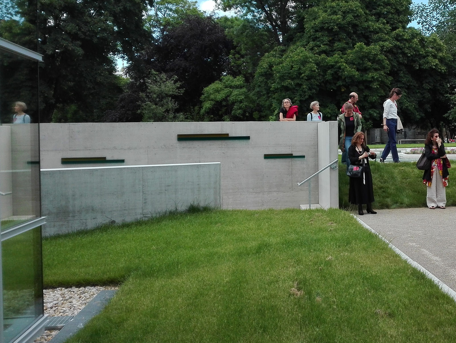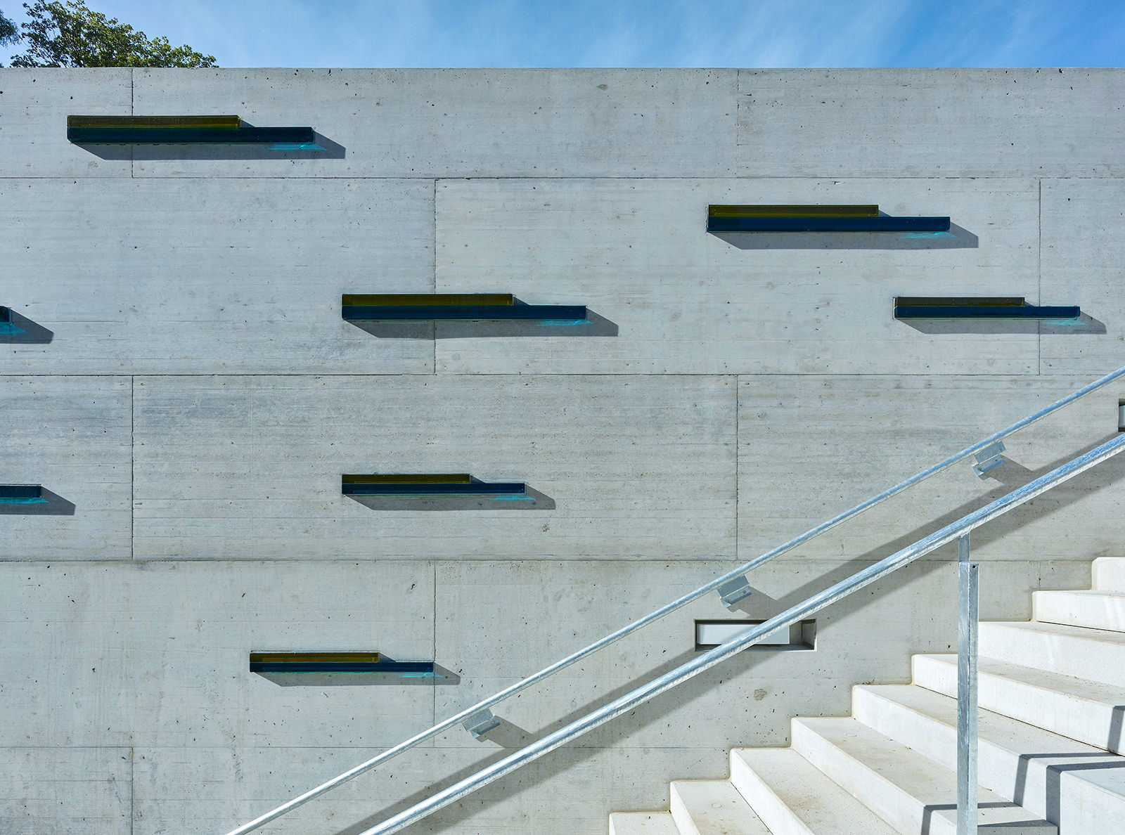 Die Sichtbetonmauer ist rasterartig mit zweifärbigen Glaskuben entsprechend eines Balkendiagramms strukturiert. Drei unterschiedliche Dimensionen imaginieren eine räumliche Tiefenwirkung und verstärken so die inhaltlich sparten- und regionsübergreifende Bedeutung.
